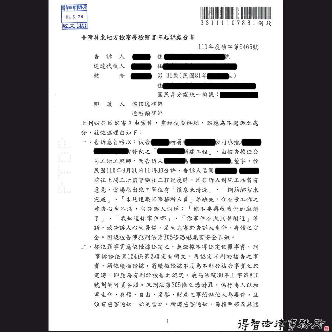黃先生為A公司的工地工程師,承攬林先生的新建工程。林先生是工程出身,會在現場對施工提出缺失及指示,兩人進而發生口角衝突,林先生問黃先生住那裡,黃先生則回以「我就住在你家旁邊,我知道你家住哪裡」,因此林先生向檢察官告訴黃先生對他有恐嚇的情事,黃先生因而委任本所所長侯信逸律師及連彬翰律師為其答辯及陪同偵查,最終獲得不起訴處分!