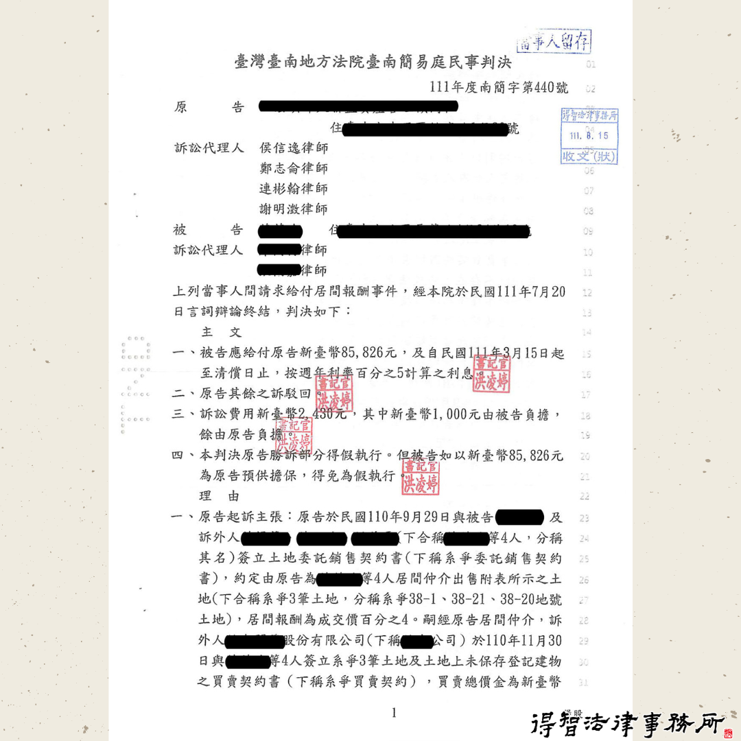 小楊受甲、乙、丙、丁4位A、B、C地地主所託求售三筆土地,約定甲、乙、丙、丁需各給小楊土地成交價1%作為居間報酬,並以其他約定事項第2條附有以共有人行使優先承購權為買賣契約之解除條件。小楊並找到一位買家戊願意以總價2300萬買下A、B、C三筆土地及土地上未保存登記建物,並與甲乙丙丁簽下土地買賣契約,因此甲須給付23萬元予小楊。然而,C地另有一位共有人己欲行使優先承購權來購買C地,甲為省下居間報酬,吆喝乙、丙、丁與戊解約,並拒付小楊居間報酬。嗣後小楊認為甲、乙、丙、丁此種行為係惡意違約,因此委任本所所長侯信逸律師、鄭志侖律師及謝明澂律師起訴請求甲給付居間報酬。