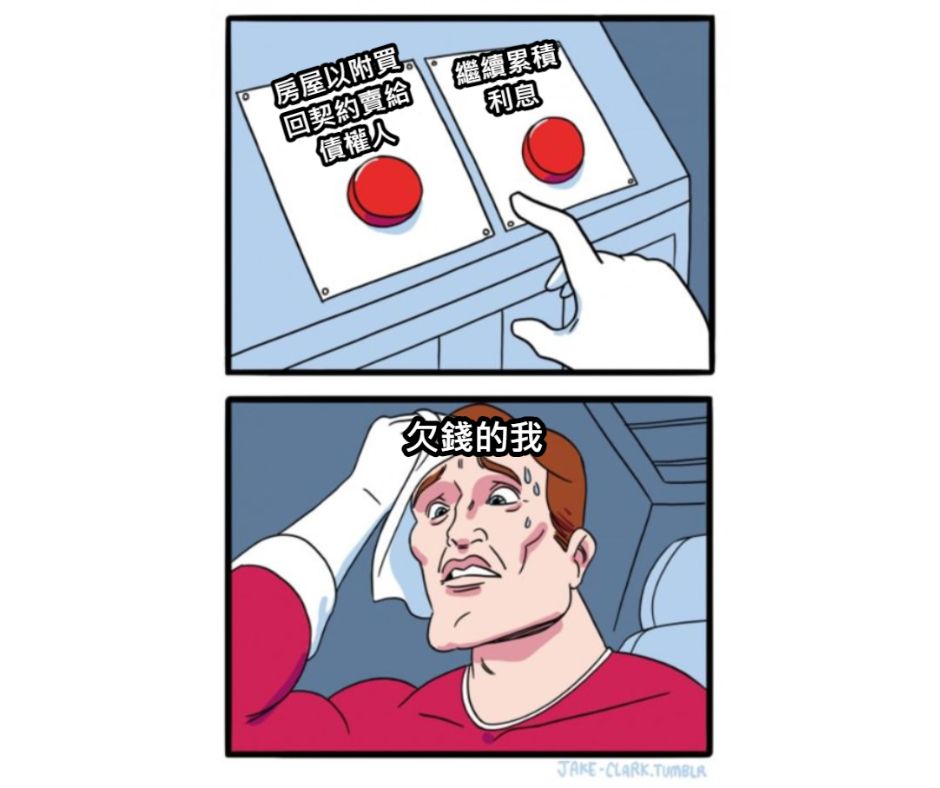 Q:小明因手頭拮据,故而以自己名下的房屋做抵押,向民間借貸機構借了一筆資金,想要藉此渡過暫時的難關,不曾想日後卻因為民間借貸機構的利息較高,每個月光支付利息就已經精疲力竭,更不用說清償本金,直到累積積欠的金額已經接近自己名下房屋之價額,此時民間借貸機構卻提出,因積欠之金額與房屋價額相當,要小明先將房屋以買賣名義過戶給民間借貸機構,民間借貸機構再將房屋出租給小明,並於房屋買賣契約中加註小明如果日後能將債務全數清償,即可以原價將房屋買回,也就是透過房屋買賣契約先行轉讓房屋後,小明原本每個月要用來償還利息的金錢,變成給付租金,但債務的本金不會繼續增加,聽到債務不會因為還不出利息繼續累積,小明有點心動,但不知道這種附買回的不動產買賣契約會不會有陷阱,想了解這種契約簽了是否會有什麼風險?